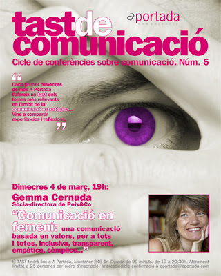 Cristina Salvador, directora de la agencia de Comunicación A Portada Comunicació de Barcelona, me ha invitado el próximo miércoles 4 de marzo a las 7 de la tarde para hablar de empatia, asertividad, intuición, transparencia, … es decir; de la Comunicación en Femenino.